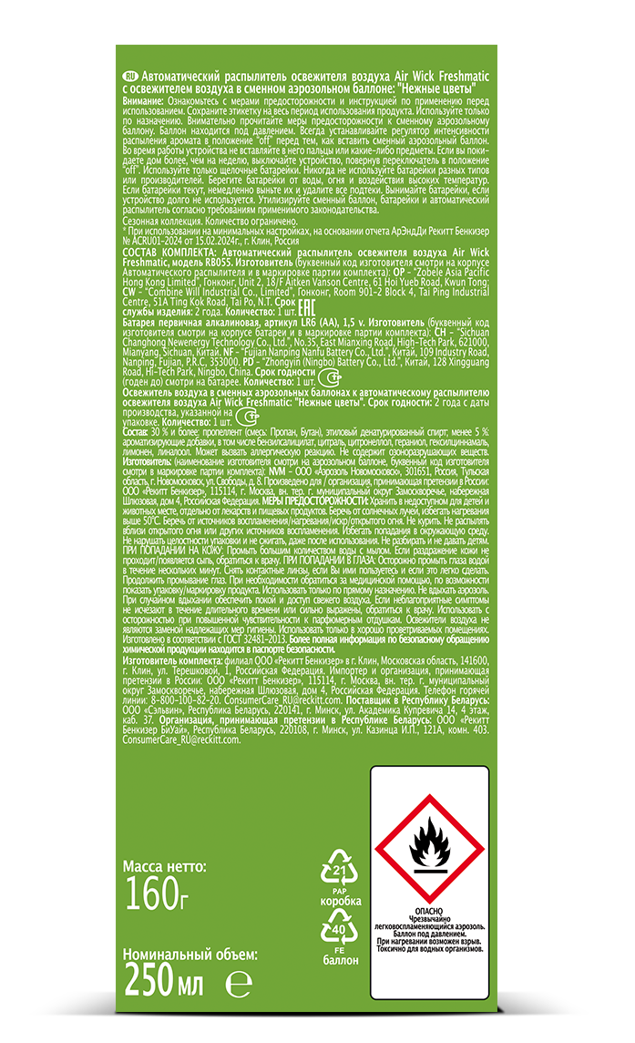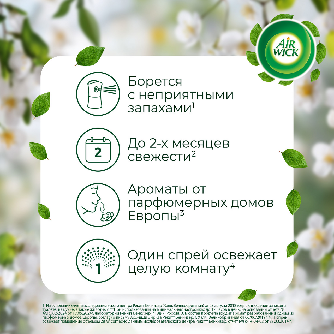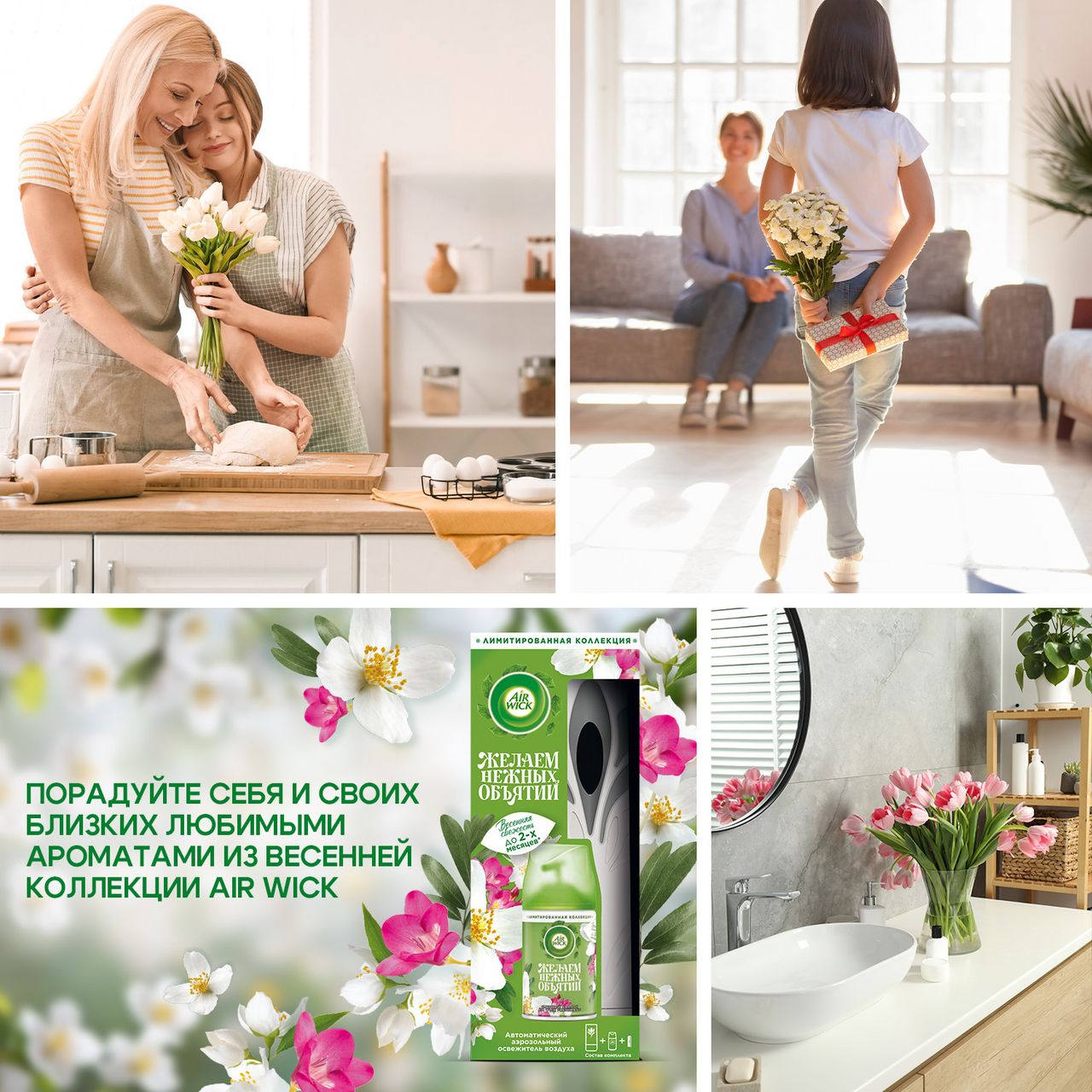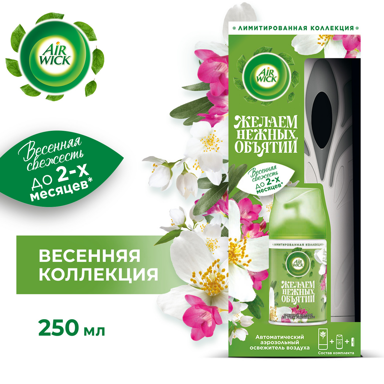 Специально для вас Air Wick разработал особую подарочную весеннюю коллекцию с пожеланиями для самых дорогих людей. Создайте особенную весеннюю атмосферу у вас дома с утонченной композицией ароматов белых цветов с сладковатыми нотами водяной лилии. Наполните каждый уголок своей комнаты ароматом, вдохновленным природой, чтобы создать приятную атмосферу. Прекрасно борется с любыми нежелательными запахами. Его можно устанавливать на кухне, в ванной комнате или туалете. Аэрозоль не оставляет разводов и других следов на занавесках, мебели и других предметах. Средство будет наполнять помещение приятным ароматом около 60 дней. Отдушки содержат специальный компонент, который устраняет запах табака. Перед тем, как вставить аэрозоль, убедитесь, что диспенсер выключен.