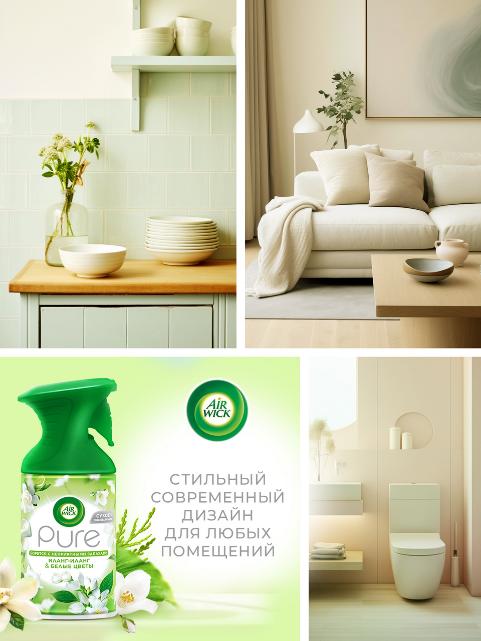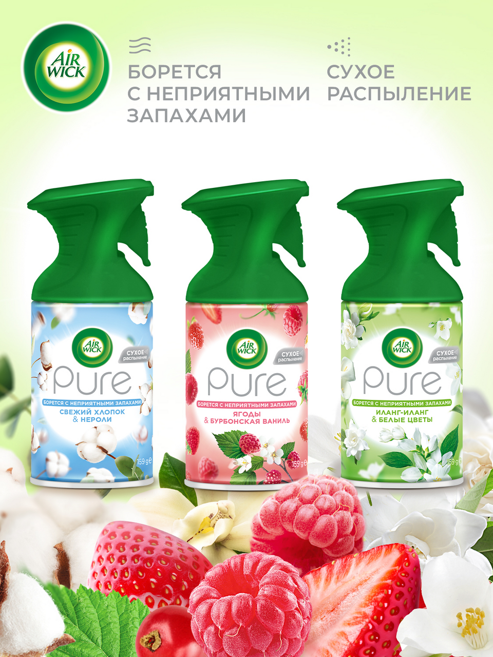 Спрей ароматический Air Wick Pure эффективно устраняет неприятные запахи и позволяет погрузиться в атмосферу приятных ароматов в 10 раз сильнее, чем обычные аэрозоли.