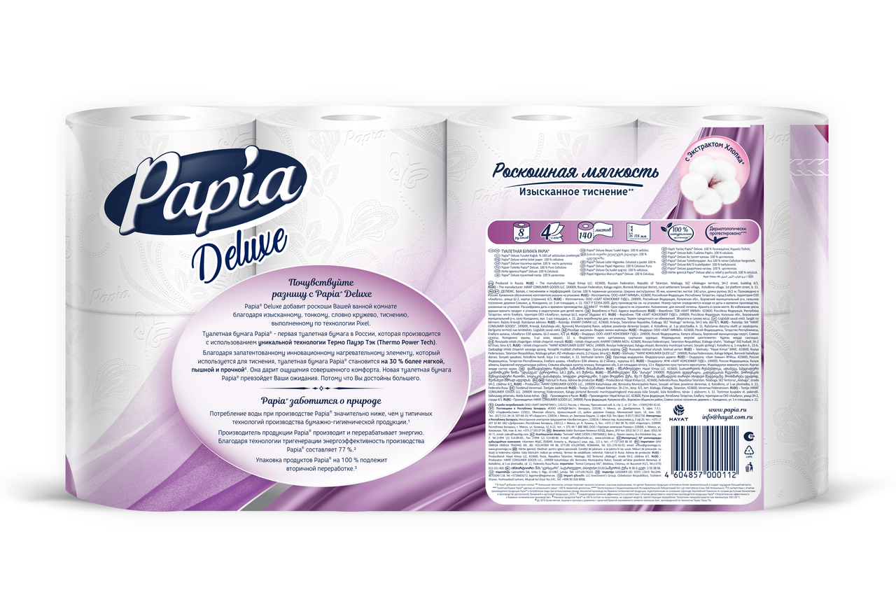 Туалетная бумага Papia Deluxe белая. Прибавьте еще один слой к великолепию: Papia Делюкс 4 слоя. Роскошно мягкая, ослепительно белоснежная, прочная и впитывающая. Туалетная бумага Papia Deluxe (Делюкс) белая с тиснением и перфорацией.