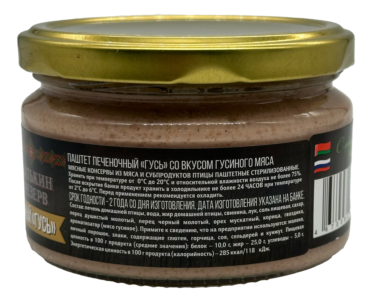 Паштет печеночный Гусь, это нежнейшая закуска из печени и мяса гуся. Это высококачественный продукт, выполненный из отборной гусиной печени, масла, лука и других натуральных специй. Паштет имеет нежную, кремообразную текстуру и богатый, насыщенный вкус, который достигается благодаря профессиональной кулинарной обработке и использованию только качественных ингредиентов.