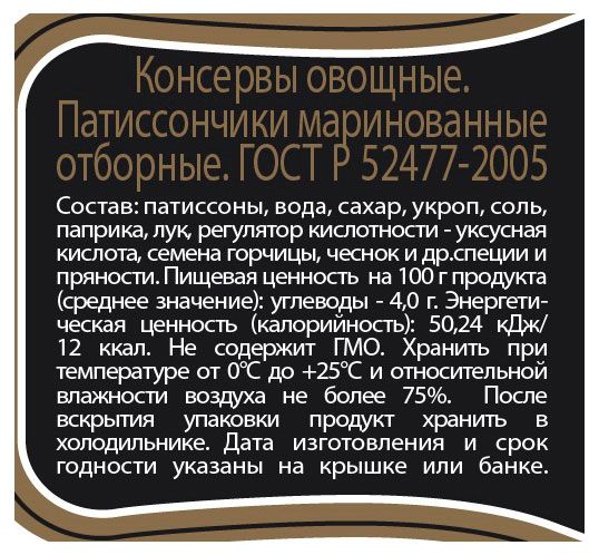 Патиссоны маринованные Скатерть-Самобранка общим весом 720 мл в банке. Внутри находятся маленькие овощи, диаметр которых не превышает пятирублевой монеты. В одной баночке может быть от 12 до 15 патиссончиков. Маринад отличается абсолютной прозрачностью, без присутствия мути. Сами овощи отличаются великолепным, насыщенным вкусом, очень хрустящие и сочные. Мелкие семечки внутри патиссонов практически незаметны. Продукт прекрасно подойдет к семейным ужинам или обедам, станет достойным украшением праздничного стола. Мелкие и симпатичные патиссончики можно использовать для украшения разных блюд.