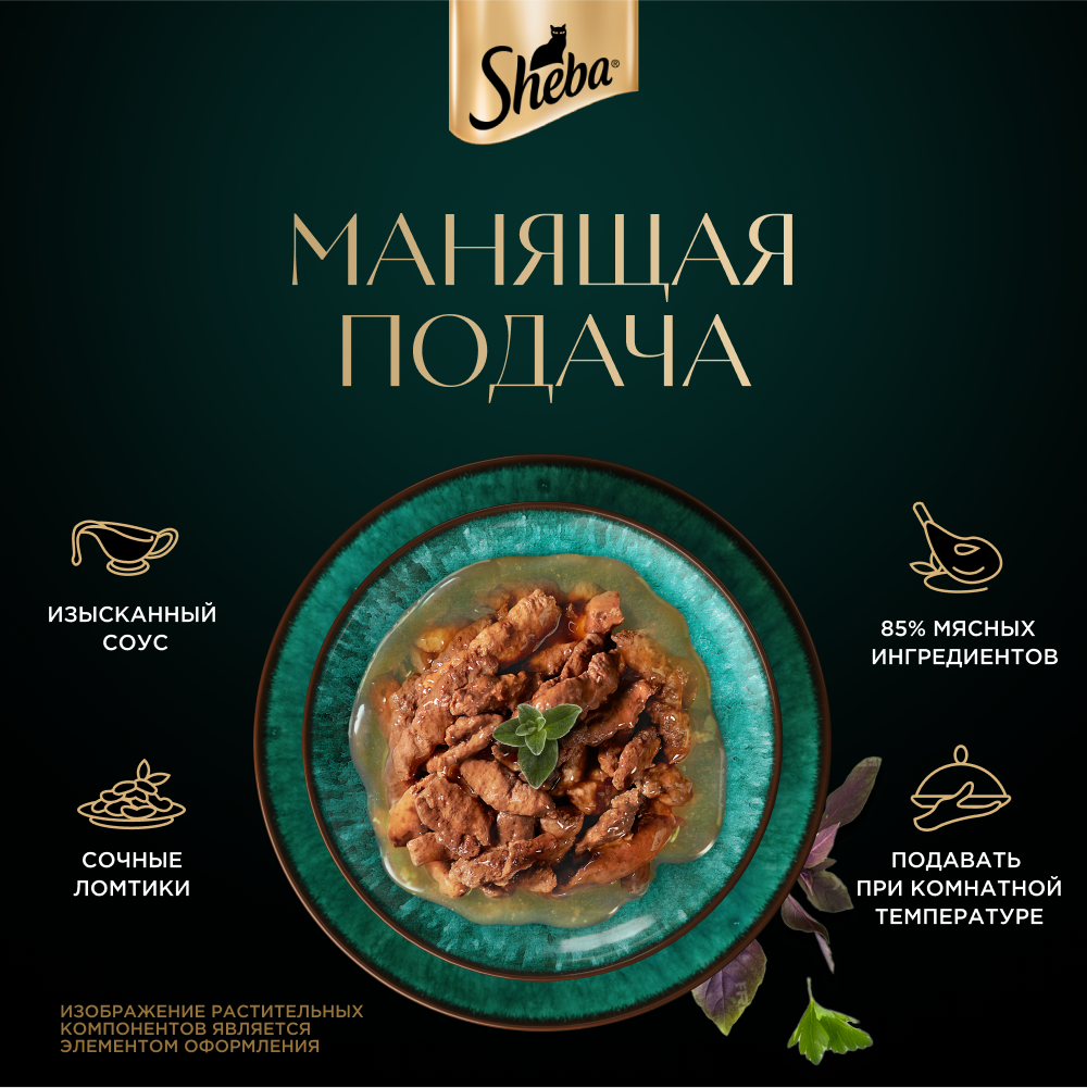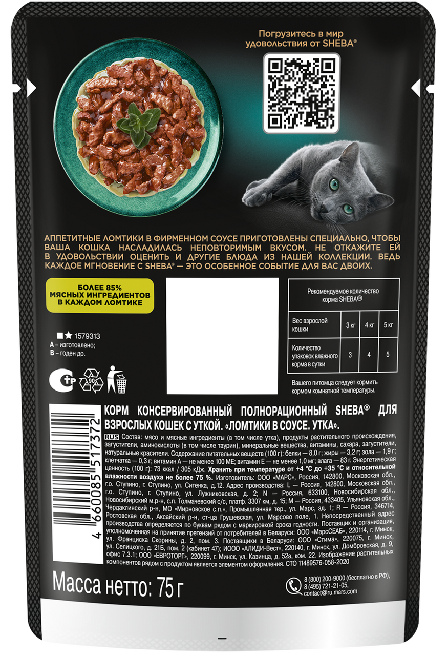 Сочные ломтики с уткой в фирменном соусе - блюдо из высококачественных ингредиентов, которое придётся по вкусу самым притязательным кошкам. Мы приготовили его по особому рецепту, чтобы раскрыть всю красоту вкуса и сохранить баланс витаминов, минералов и аминокислот, необходимых вашей любимице. Подарите своей кошке особое удовольствие, побаловав ее всеми блюдами из коллекции Sheba.
