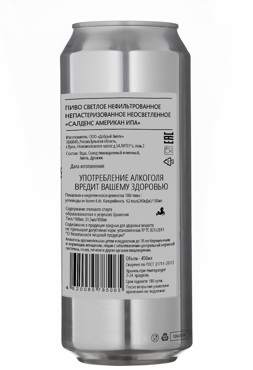 Проверенный временем сорт пивоварни, который выпускается уже более семи лет и входит в постоянную линейку сортов. Настоящий IPA в американском стиле, ведь он наполнен оттенками сразу шести хмелей Нового Света: Citra, Mosaic, Amarillo, Simcoe, Centennial и Columbus. Лёгкий, не смотря на достаточно уверенную для стиля горечь, с оттенками цитрусовых и косточковых фруктов, которые дополняет мягкая и чуть вяжущая смолянистость на финише. Светлый эль в стиле Американ ИПА, изготовленный по авторскому рецепту пивоваров компании Salden's. В производстве эля используется исключительно натуральное сырье: вода, хмель, солод, пивные дрожжи. Для изготовления пива используют 4 сорта хмеля: Columbus, Citra, Chinook, Centennial. В соответствии с американской классификацией хмелей, данные сорта входят в группу C Hop, что указывает на преобладание цитрусовых нот в богатом букете. Технология сухого охмеления позволяет получить более насыщенный и глубокий аромат. Пиво обладает плотностью 16,5% и выразительной горчинкой на уровне 60 IBU. Пиво не подвергается пастеризации и фильтрации, благодаря чему получается живым и свежим. Оно хорошо дополнит блюда из мяса, колбасные изделия, тушеные овощи и легкие закуски.