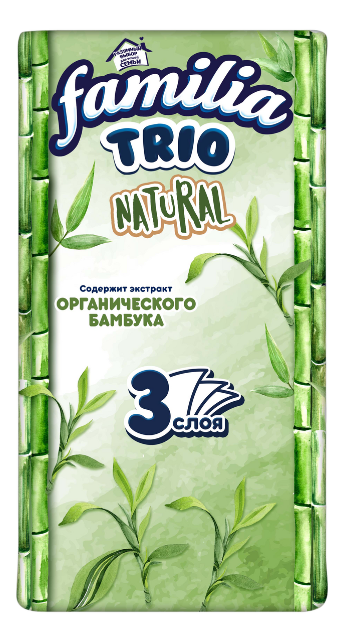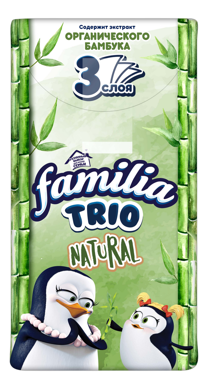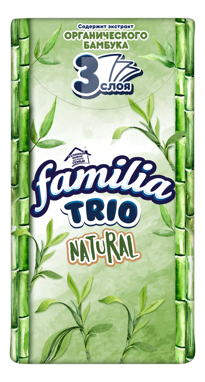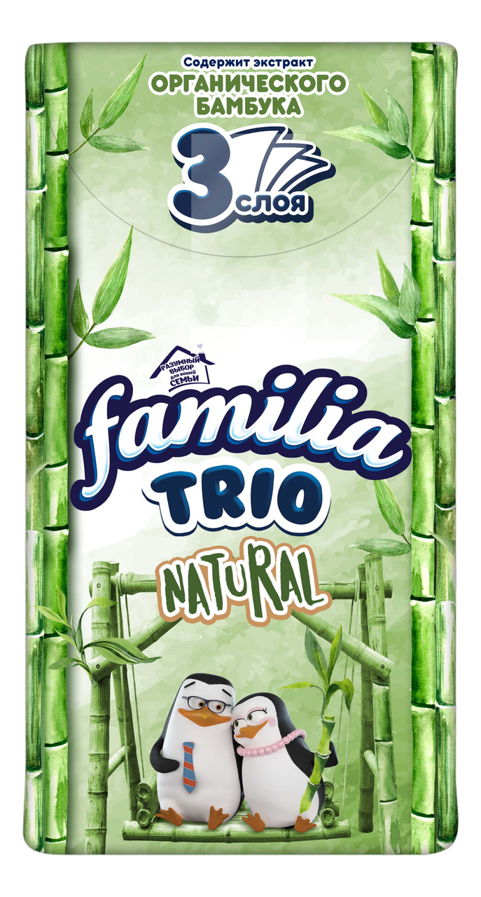 Носовые платочки Familia Trio легко поместятся в сумку. Очень нежные и мягкие. Трёхслойные носовые платочки произведены из 100% первичной целлюлозы с добавлением экстракта органического бамбука, они очень впитывающие и прочные. Удобны для того, чтобы всегда иметь их под рукой: во время прогулок, на работе или дома. Они изготовлены из 100% натуральной целлюлозы, поэтому не травмируют кожу даже во время частого использования. Благодаря трехслойному исполнению платочки отлично впитывают влагу, при этом не распадаясь. Технология изготовления платочков на новейшем оборудовании полностью исключает участие человека и гарантирует соответствие всем международным санитарным и гигиеническим нормам.
