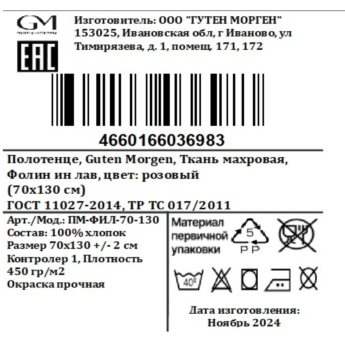 Полотенце махровое Guten Morgen Фолин ин лав розовое, 70 x 130см