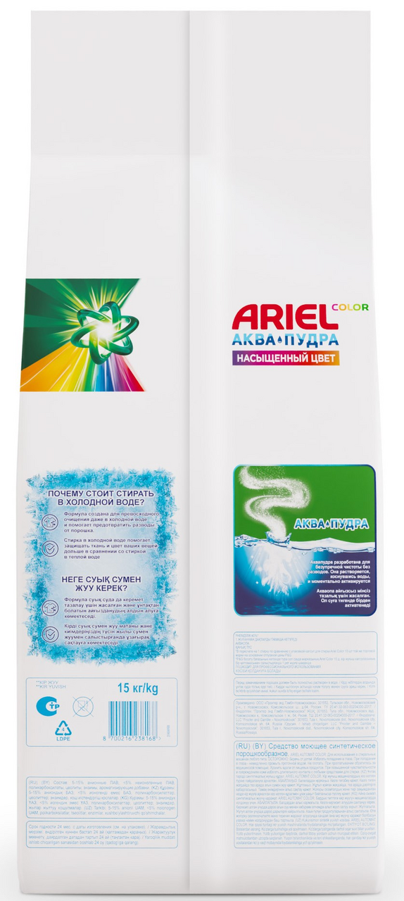 Стиральный порошок Ariel Color Автомат для стиральной машины предназначен для стирки цветного и белого белья. Благодаря технологии Аквапудра, порошок для стирки Ariel Color растворяется, едва коснувшись воды, и моментально активируется: глубоко проникает в структуру волокон и удаляет сложные пятна, не давая загрязнениям въедаться. Ariel Color удаляет даже невидимые загрязнения, устраняя неприятные запахи и предотвращая изменение цвета ткани, в том числе на воротничках и манжетах. Выгодный объем упаковки 15 кг позволяет экономить на каждой стирке по сравнению с покупкой маленькой упаковки. Преимущества Ariel Color: Безупречное удаление пятен с первой стирки даже при 30C; Порошок быстро растворяется, не оставляя следов на одежде; Сохраняет яркость цветных вещей; Помогает справиться с застарелыми пятнами; Не дает грязи и пятнам въедаться в структуру волокон; 0% фосфатов и хлорного отбеливателя. Для максимально удобного процесса стирки попробуйте также капсулы Ariel Color.