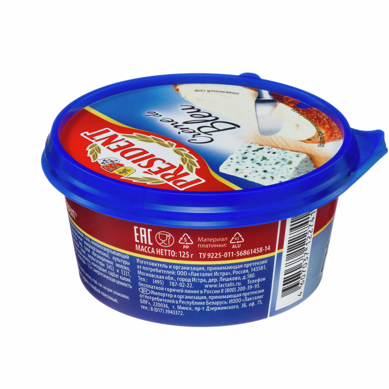 Сыр President Creme De Bleu, 125г БЗМЖ входит в линейку продуктов на основе элитных сырных сортов. Благородная голубая плесень придает ему выраженный пикантный вкус. А за счет натурального коровьего молока в составе он обладает нежной текстурой, похожей на густые сливки. Сыр легко намазывается на хлеб и тосты, может добавляться при приготовлении различных блюд. Он без опасений может употреблять ежедневно, так как произведен только из качественных компонентов и не содержит красителей и ароматизаторов. Продукт упакован в мини-ванночку, сохраняющую его свежесть и вкусовые качества в течение долгого времени. Состав: Cыр c голубой плесенью (молоко нормализованное, соль, молокосвертывающий ферментный препарат микробного происхождения, закваска (мезофильные и термофильные микроорганизмы), культуры благородной голубой плесени (Penicillium roqueforti)), вода питьевая, масло сливочное, сыр, сухое обезжиренное молоко, натуральный ароматизатор, экстракт спирулины, молочный белок, сыворотка молочная сухая, эмульгаторы полифосфат натрия и цитрат натрия, стабилизаторы каррагинан, камеди ксантановая и рожкового дерева, регулятор кислотности лимонная кислота, консервант сорбат калия.