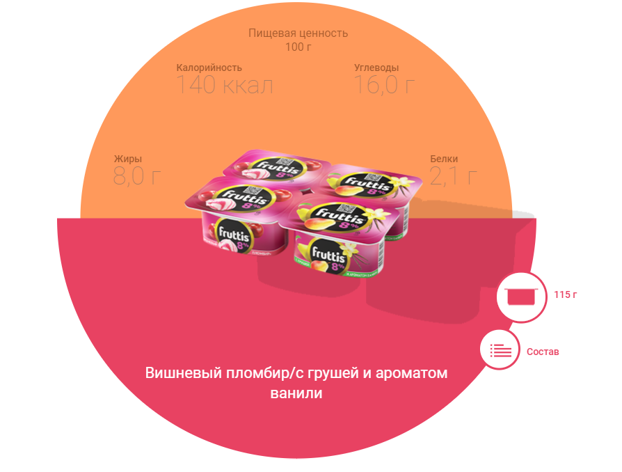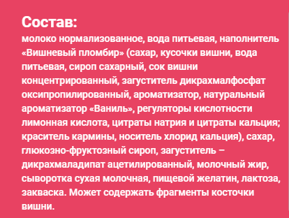 Молоко нормализованное, вода, наполнитель (сахар, вишня, вода, сахарный сироп, концентрированный вишневый сок, загуститель - дикрахмалфосфат оксипропилированный, ароматизатор, натуральный ароматизатор Ваниль, регуляторы кислотности: лимонная кислота, цитраты натрия, цитраты кальция; краситель – кармины, носитель - хлорид кальция, пектинэстераза), сахар, глюкозно-фруктозный сироп, загуститель – дикрахмаладипат ацетилированный, молочный жир, сыворотка сухая молочная, пищевой желатин, лактоза, с использованием закваски. /Состав: молоко нормализованное, вода, наполнитель (сахар, груша, вода, загуститель - дикрахмалфосфат оксипропилированный, экстракт ванили, ароматизаторы, регуляторы кислотности: лимонная кислота, цитраты натрия; краситель - каротины), сахар, глюкозно-фруктозный сироп, загуститель – дикрахмаладипат ацетилированный, молочный жир, сыворотка сухая молочная, пищевой желатин, лактоза, с использованием закваски.