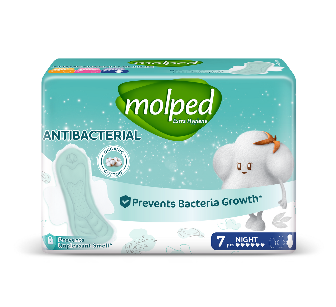 Прокладки Molped Extra Hygiene c мягкой поверхностью и добавлением органического хлопка помогают предотвратить неприятный запах, вызываемый бактериями. Специальный антибактериальный слой блокирует рост бактерий на поверхности прокладки. Molped Extra Hygiene протестированы дерматологами* и обеспечат максимальный комфорт твоей коже. * Дерматологически одобрено, ITA-TEST Laboratory, Польша, ноябрь 2023г.