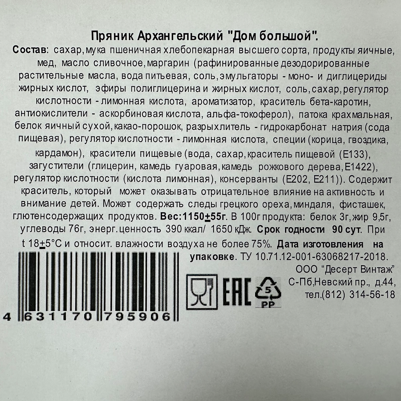 Сахар, мука пшеничная хлебопекарная высшего сорта, продукты яичные, мед, масло сливочное, маргарин рафинированные дезодорированные растительные масла, вода питьевая, соль, эмульгаторы - моно- и диглицериды жирных кислот, эфиры полиглицерина и жирных кислот, соль, сахар, регулятор кислотности - лимонная кислота, ароматизатор, краситель бета-каротин, антиокислители - аскорбиновая кислота, альфа-токоферол, патока крахмальная, белок яичный сухой, какао-порошок, разрыхлитель - гидрокарбонат натрия сода пищевая, регулятор кислотности - лимонная кислота, специи корица, гвоздика, кардамон, красители пищевые вода, сахар, краситель пищевой Е133, загустители глицерин, камедь гуаровая, камедь рожкового дерева, Е1422, регулятор кислотности кислота лимонная, консерванты Е202, Е211. Содержит краситель, который может оказывать отрицательное влияние на активность и внимание детей. Может содержать следы грецкого ореха, миндаля, фисташек, глютенсодержащих продуктов.