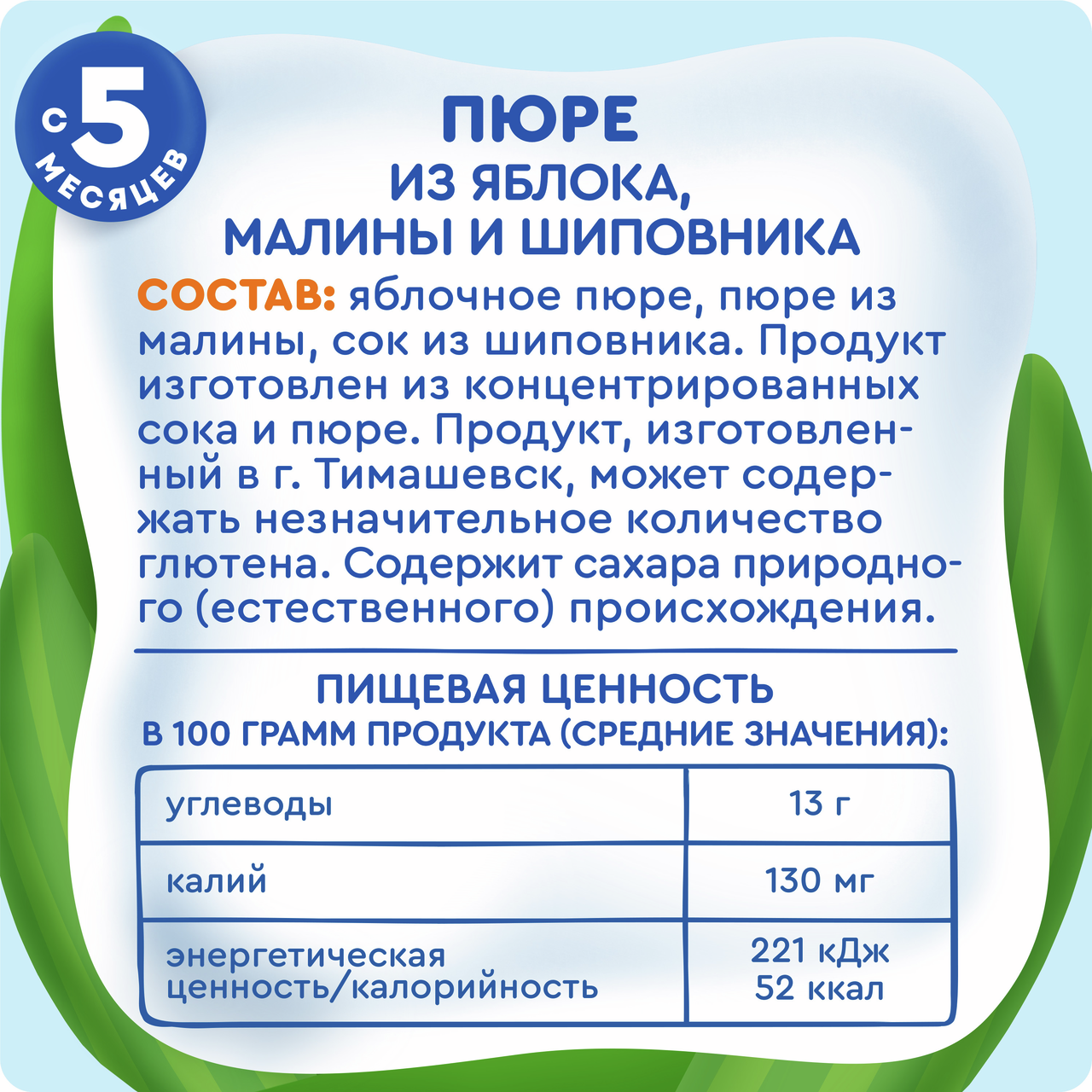 Яблочное пюре, пюре из малины, сок из шиповника. Продукт изготовлен из концентрированных сока и пюре.