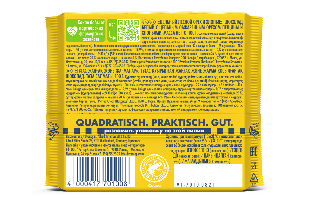 Шоколад Ritter Sport белый Цельный лесной орех и хлопья, 100г