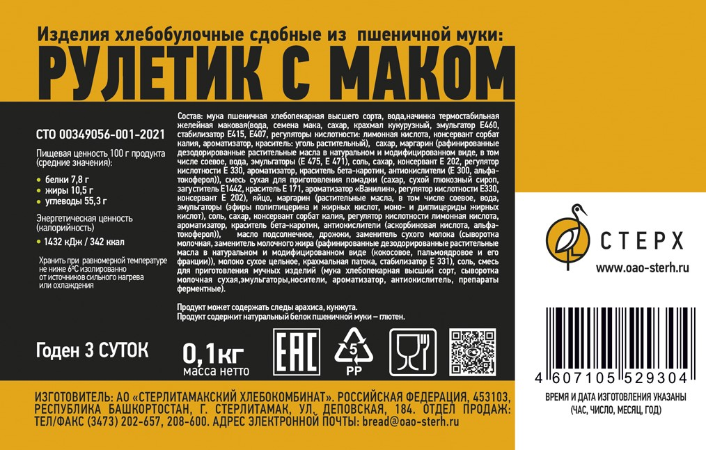 Мука пшеничная хлебопекарная высшего сорта, вода, начинка термостабильная желейная маковая (вода, семена мака, сахар, крахмал кукурузный, эмульгатор E460, стабилизатор E415, E407, регуляторы кислотности: лимонная кислота, консервант сорбат калия, ароматизатор, краситель: уголь растительный), сахар, маргарин (рафинированные дезодорированные растительные масла в натуральном и модифицированном виде, в том числе соевое, вода, эмульгаторы (E 475, E 471), соль, сахар, консервант Е202, регулятор кислотности E330, ароматизатор, краситель бета-каротин, антиокислители (E300, альфа-токоферол)), смесь сухая для приготовления помадки (сахар, сухой глюкозный сироп, загуститель E1442, краситель Е 171, ароматизатор Ванилин, регулятор кислотности E330, консервант Е 202), яйцо, маргарин (растительные масла, в том числе соевое, вода, эмульгаторы (эфиры полиглицерина и жирных кислот, моно- и диглицериды жирных кислот), соль, сахар, консервант сорбат калия, регулятор кислотности лимонная кислота, ароматизатор, краситель бета-каротин, антиокислители (аскорбиновая кислота, альфа- токоферол)), масло подсолнечное, дрожжи, заменитель сухого молока (сыворотка молочная, заменитель молочного жира (рафинированные дезодорированные растительные масла в натуральном и модифицированном виде (кокосовое, пальмоядровое и его фракции)), молоко сухое цельное, крахмальная патока, стабилизатор E 331), соль, смесь для приготовления мучных изделий (мука хлебопекарная высший сорт, сыворотка молочная сухая, эмульгаторы, носители, ароматизатор, антиокислитель, препараты ферментные).