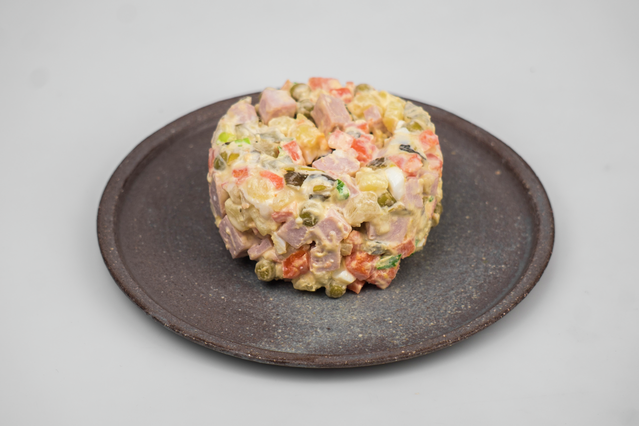 Картофель отварной, майонез (масло подсолнечное, вода, желток яичный, соль, пищевые добавки: лимонная кислота -регулятор кислотности, ксантановая камедь - стабилизатор, сорбат калия -консервант, крахмал картофельный , крахмал кукрузный-загустители), морковь отварная, огурцы соленые, ветчина (свинина, вода, соль, соевый белок, сухое молоко, стабилизаторы E-450, E-452, E-407), колбаса вареная (мясо птицы механической обвалки (куриное), мука пшеничная, вода, манная крупа, белок животный куриный, соль, чеснок сушеный, перец черный, тмин, сельдерей, лук, куркума, горчица, усилитель вкуса и аромата E-621, стабилизаторы: гуаровая и ксантановая камедь, камедь рожкового), горошек консервированный, соль , пищевая добавка: консерванты: E-211, E-202. Продукт может содержать следы арахиса, яичных продуктов, рыбы, морепродуктов, соевых бобов.