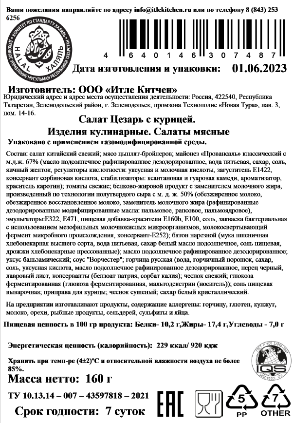 Салат китайский свежий; мясо цыплят-бройлеров; майонез Провансаль классический с м. д. ж. 67% масло подсолнечное рафинированное дезодорированное, вода питьевая, сахар, соль, яичный желток, регуляторы кислотности: уксусная и молочная кислоты, загуститель Е1422, консервант сорбиновая кислота, стабилизаторы: ксантановая и гуаровая камеди, ароматизатор, краситель каротин; томаты свежие; батон нарезной мука пшеничная хлебопекарная высшего сорта, вода питьевая, сахар белый, масло подсолнечное, соль пищевая, дрожжи хлебопекарные прессованные; белково-жировой продукт с заменителем молочного жира, произведенный по технологии полутвердого сыра с м. д. ж. 50% обезжиренное молоко, обезжиренное восстановленное молоко, заменитель молочного жира рафинированные дезодорированные модифицированные масла: пальмовое, рапсовое, пальмоядровое, эмульгаторы: Е322, Е471, пищевая добавка-красители Е160b, Е100, соль, закваска бактериальная с использованием мезофильных молочнокислых микроорганизмов, молокосвертывающий фермент микробного происхождения, консервант-Е252; масло подсолнечное рафинированное дезодорированное; соль пищевая выварочная; чеснок свежий; сахар белый кристаллический; соус Ворчестер; горчица русская вода, горчичный порошок, сахар, соль, уксусная кислота, масло подсолнечное рафинированное дезодорированное, перец черный, лавровый лист, консерванты бензоат натрия, сорбат калия; бальзамический уксус из Модены винный уксус, концентрированное виноградное сусло; глюкоза ферментированная глюкоза ферментированная, стабилизатор мальтодекстрин; приправа для курицы; чеснок сушеный.