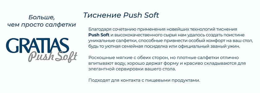 Бумажные салфетки сервировочные с уникальным однородным тиснением Push Soft, имитирующим текстуру ткани, которое обеспечивает феноменальное впитывание и неповторимую мягкость. Очень мягкая поверхность, делает салфетку идеальной для снятия излишков макияжа, помады. Используйте их, чтобы промокнуть лицо после нанесения крема. Подходят для нежной кожи детей. Идеальны для кухни, праздничной сервировки стола и декора, создания элегантной сервировки. Стильные, большого размера 33х33см в развернутом виде, 2 слоя, 50шт. Подходят для лица, рук. Эти сухие салфетки хорошо держат форму в любой салфетнице, плотные и воздушные. Хорошо впитывают влагу и могут использоваться на кухне, чтобы быстро навести порядок, как замена или дополнение к бумажным полотенцам. Помогут поддержать чистоту в доме.