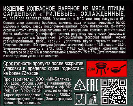 Мясо цыпленка бройлера, свинина, вода питьевая, животный белок, молочный белок, смеь посолочно-нитритная (соль поваренная, фиксатор окраски нитрит натрия), крахмал, растительный елок, стабилизатор (полифосфат натрия), регулятор кислотности (трифосфат натрия), загуститель (каррагинан), антиокислитель (аскорбат натрия), чеснок гранулированный, перец черный, усилитель вкуса (глутомат натрия).