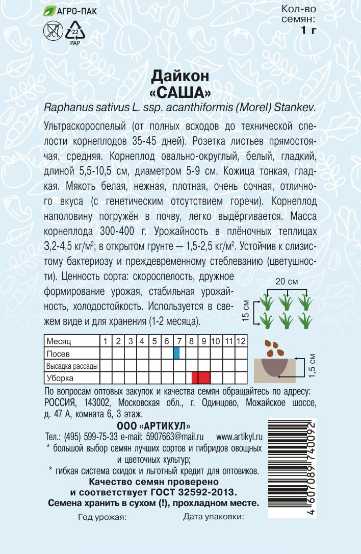 Семена Артикул Дайкон Саша, 10г