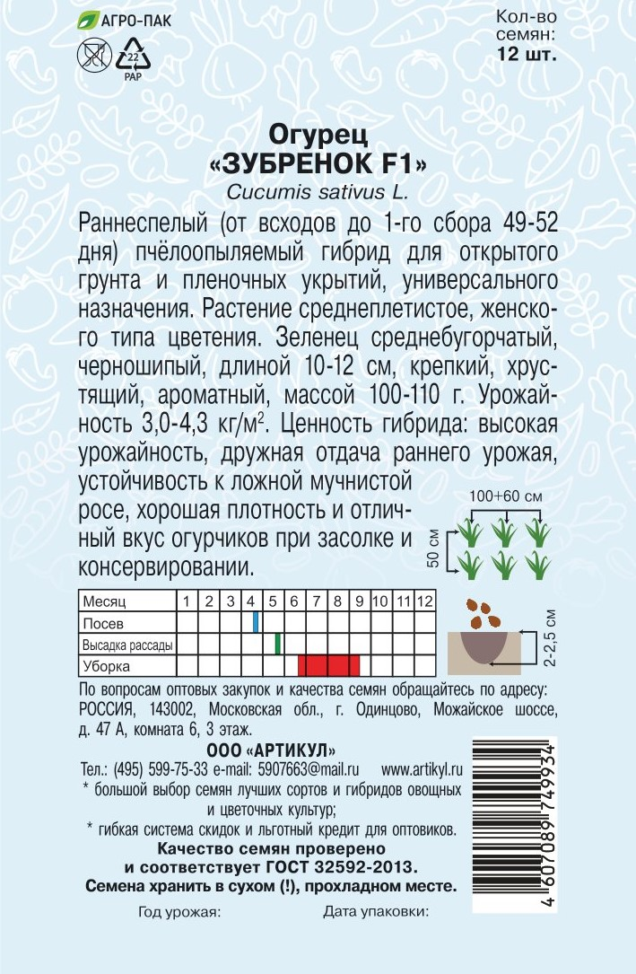 Раннеспелый (от всходов до 1-го сбора 49-52 дня) пчёлоопыляемый гибрид для открытого грунта и пленочных укрытий, универсального назначения. Растение среднеплетистое, женского типа цветения. Зеленец среднебугорчатый, черношипый, длиной 10-12 см, крепкий, хрустящий, ароматный, массой 100-110 г. Урожайность 3,0-4,3 кг/м2. Ценность гибрида: высокая урожайность, дружная отдача раннего урожая, устойчивость к ложной мучнистой росе, хорошая плотность и отличный вкус огурчиков при засолке и консервировании. + Огурцы улучшают аппетит, способствуют усвоению пищи и выводу шлаков из организма.