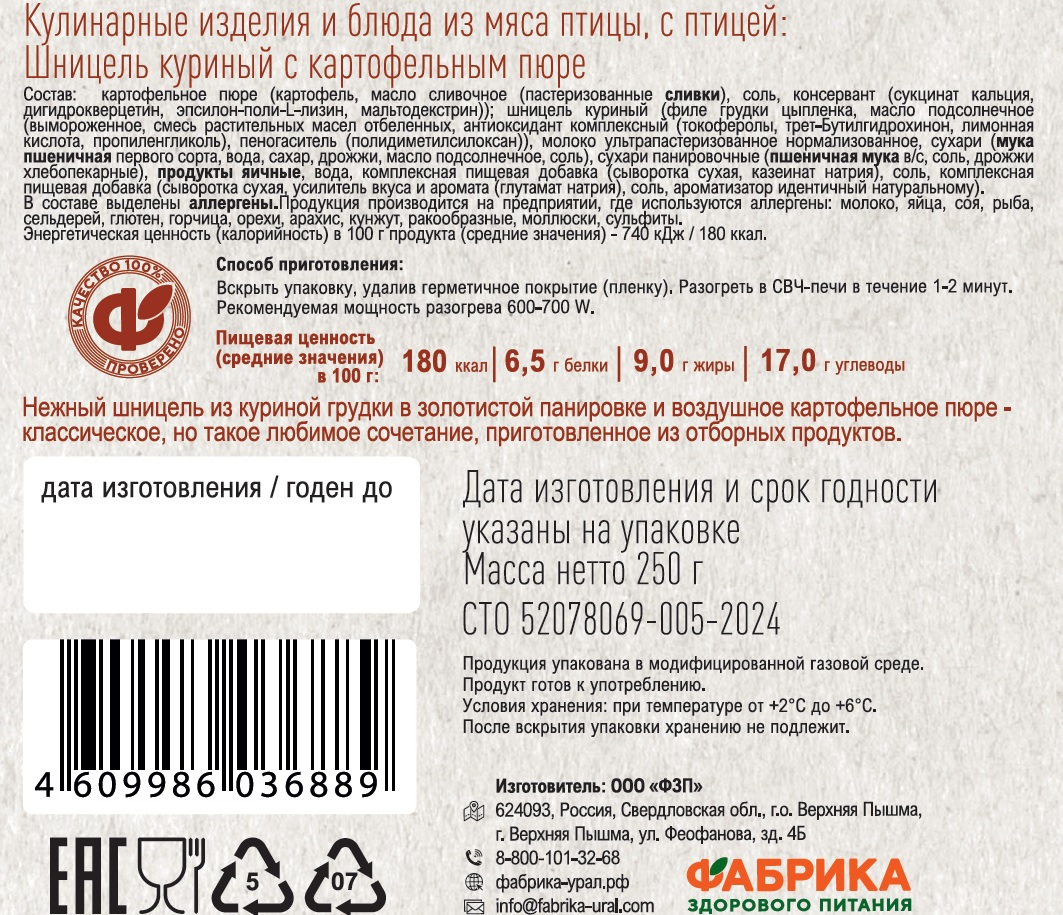 Шницель куриный Фабрика здорового питания с пюре, 250г