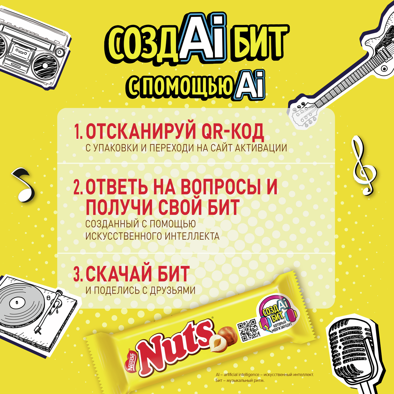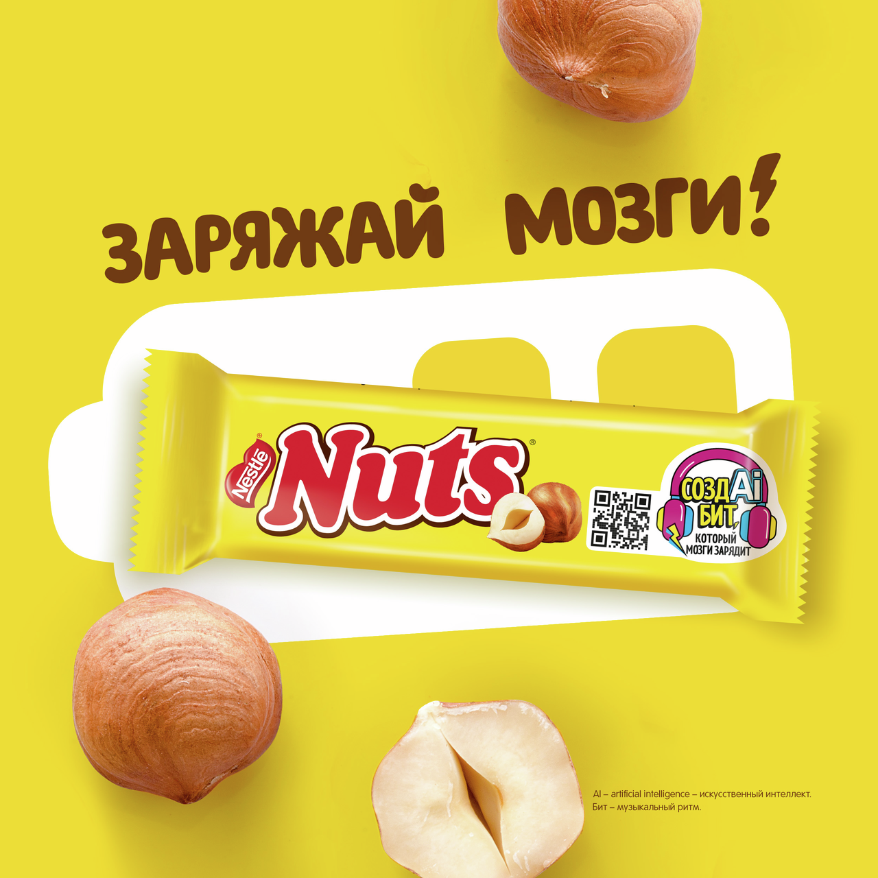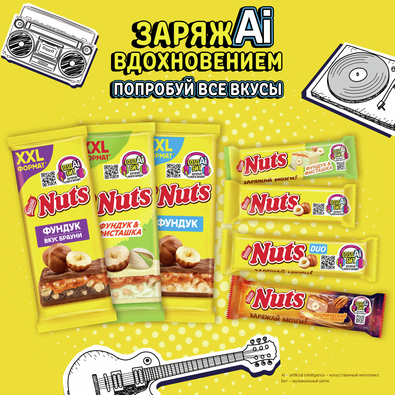 Шоколадный батончик Nuts с цельным фундуком, карамелью и нежной нугой, покрытый молочным шоколадом. Компания Нестле является одним из крупнейших производителей в таких кондитерских категориях, как шоколадные плитки, батончики, конфеты в коробках и жевательный мармелад. Внеся значительный вклад в историю развития шоколада, мы продолжаем радовать наших потребителей, предлагая широкий ассортимент любимых вкусов.