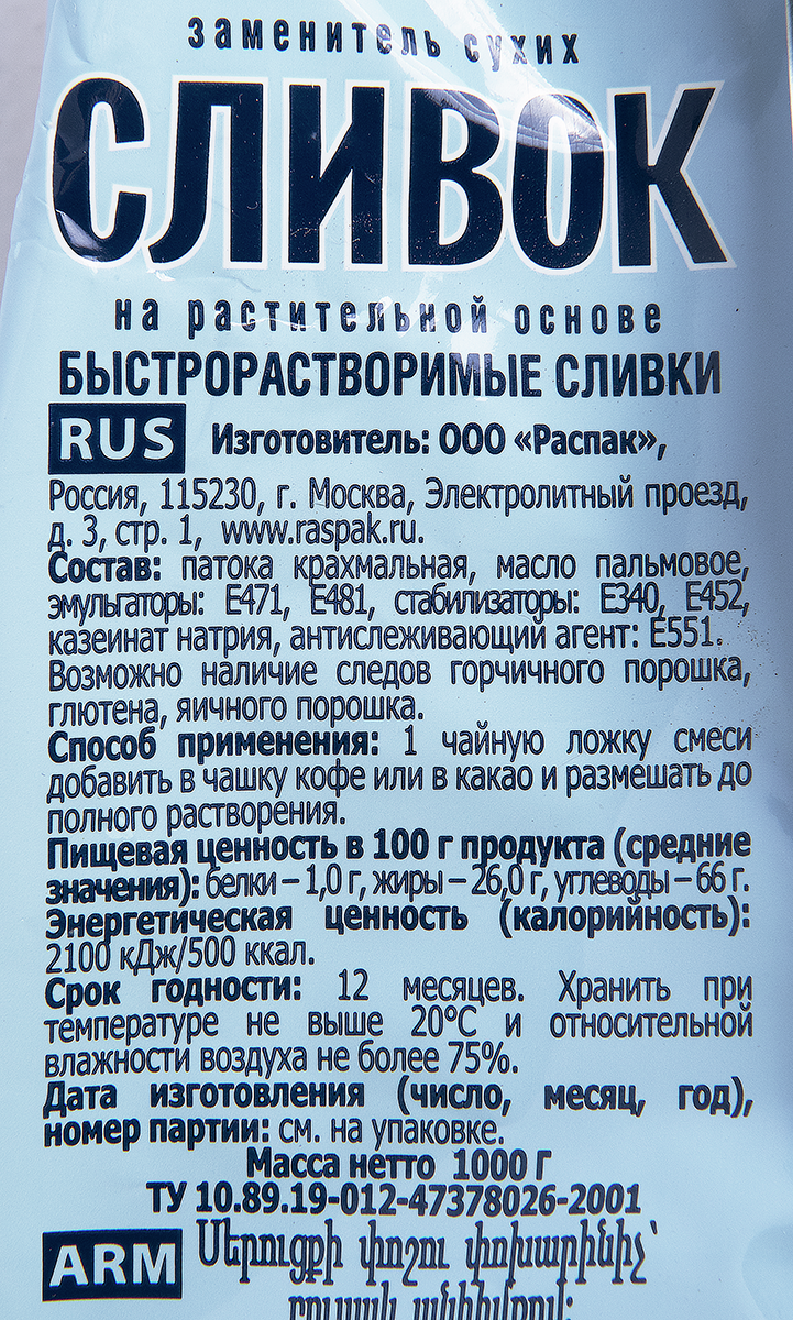 Сливки сухие быстрорастворимые Распак изготовлены по современной европейской технологии из высококачественного растительного сырья и обладают насыщенным вкусом молока. Их можно использовать в качестве добавки к кофе, чаю или какао: 1—2 чайных ложки смягчат текстуру напитков, добавив нежный сливочный оттенок. Продукт можно включать в состав ингредиентов домашней выпечки, сладких соусов и запеканок. Кроме того, сухие сливки могут стать основой для приготовления кремов и муссов, а смешав их с сахарной пудрой, вы получите необычную посыпку для сырников и оладий. Продукт не содержит холестерина и подходит для включения в диетическое и вегетарианское меню. Надежная фольгированная упаковка предотвращает проникновение влаги и посторонних запахов.