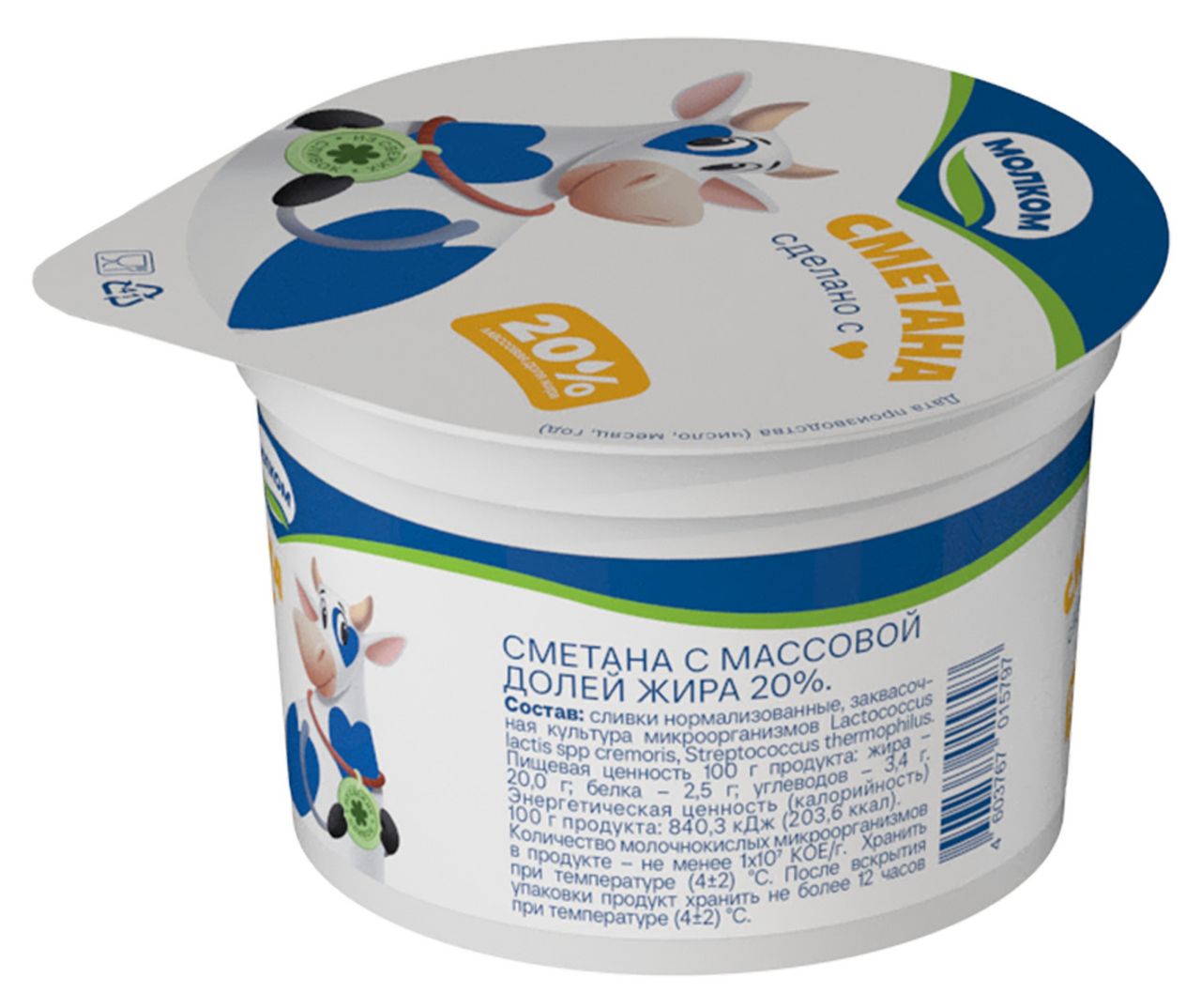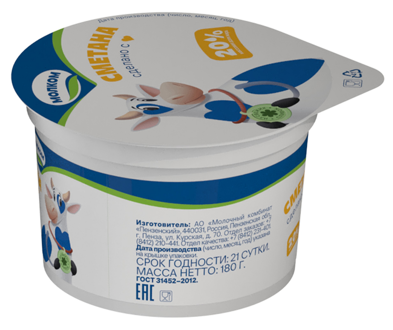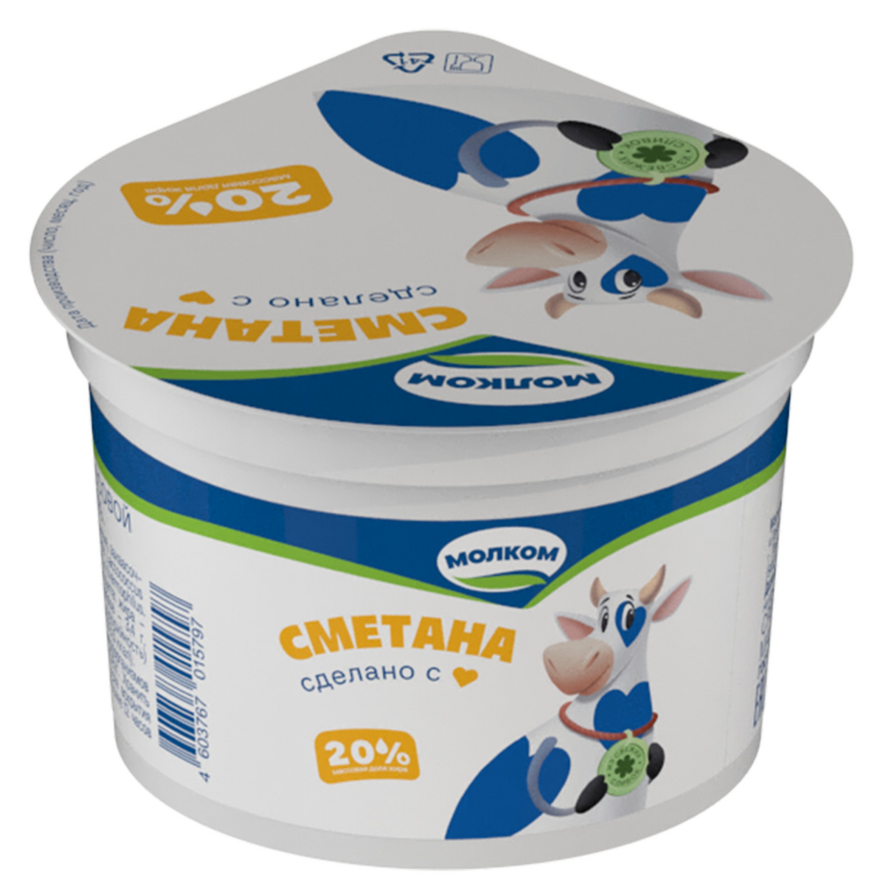 Сметана молочная жирностью 20%, произведенная предприятием Молком, расфасована в пластиковые стаканчики весом 180 грамм. Используется в кулинарии для заправки салатов, супов, приготовления десертов и выпечки. Обладает нежным вкусом и кремообразной консистенцией.