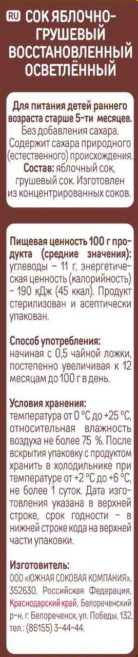 Готовый продукт к употреблению, легкий перекус. Это продукт на основе артезианской воды и натуральных соков, который не содержит сахар, красителей и консервантов. Напиток идеально подходит для детей с 12 месяцев, благодаря своей легкой и безопасной рецептуре. В составе сочетаются свежие соки яблока и груши, которые дополняются чистой водой для мягкого и приятного вкуса.