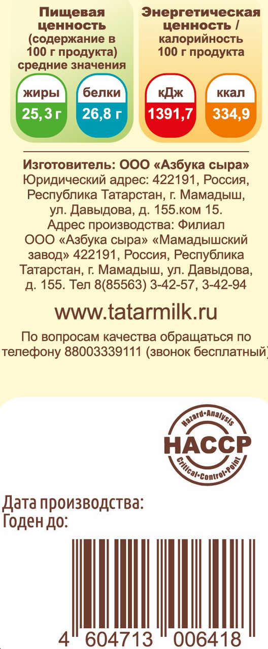 Молоко цельное, молоко обезжиренное, соль пищевая, бактериальная закваска термофильных молочнокислых микроорганизмов, молокосвертывающий сычужный ферментный препарат животного происхождения (телячий), ферментный препарат лизоцим (натуральный бактерицидный препарат получен из яичных белков), пищевая добавка краситель аннато (вода, краситель норбиксин, регулятор кислотности гидроксид калия).