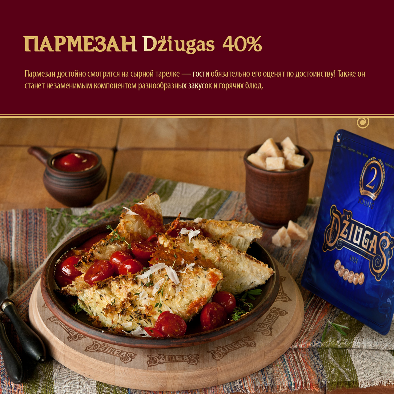 Сыр Dziugas Пармезан 2 месяца выдержки 40%, 200г – продукт с ярким и насыщенным вкусом с нотками пикантности, изготовленный на основе пастеризованного молока, дополненного молочнокислыми микроорганизмами, молокосвертывающим ферментным препаратом микробного происхождения. Он обладает твердой и ломкой текстурой, которая легко раскалывается или отламывается. Корочка чуть темнее внутренней части. Продукт имеет богатый химический состав. В частности, в нем содержится кальций, который важен для того, чтобы кости и зубы были прочными. Витамины группы B оказывают положительное влияние на нервную систему и улучшают состояние волос, кожи. L-карнитин, также присутствующий в таком виде сыра, способствует расщеплению жиров. Высокое содержание белка стимулирует процессы клеточной регенерации. В кулинарии твердый сыр нашел достаточно широкое применение. Он хорошо подходит в качестве дополнения к сырной тарелки или ингредиента салата из свежих овощей. В тертом виде такой сыр служит дополнением для пасты, пиццы или горячего блюда. В самостоятельном виде он хорошо сочетается с виноградом, орехами, медом, свежим инжиром, который придают ему неповторимый и незабываемый вкус.