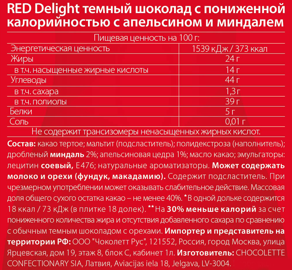 Полезные и здоровые сладости! Изысканный темный шоколад с кусочками средиземноморского апельсина и калифорнийского миндаля. Яркий насыщенный вкус для ценителей темного шоколада. Теперь в удобном формате батончика - удобно взять с собой на перекус. А еще Red это: Меньше калорий, чем в аналогичном шоколаде других марок. Приятный вкус: отборное какао из Cte d’Ivoire и особая рецептура, благодаря которым вкус шоколада Red так ценят потребители. Red - как часть спортивного питания: в одном шоколадном батончике Red всего 100 ккал - удобно при подсчете калорий, он сладкий, но без сахара - идеально для читмила (планового нарушения диеты).
