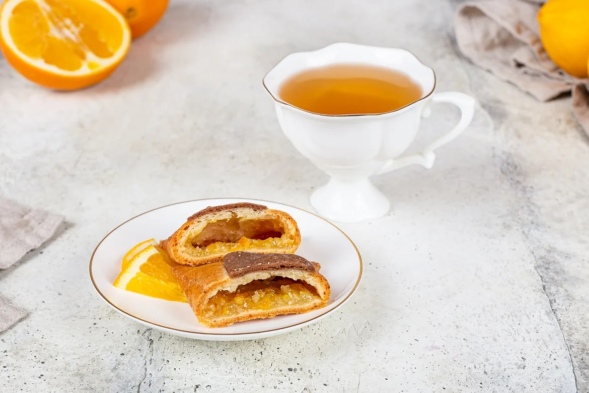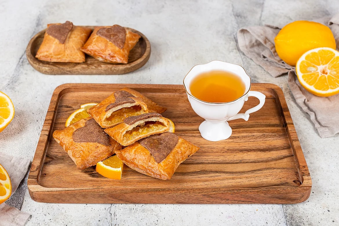 Изящные конвертики изготавливаются из тонко раскатанного нежного легкого песочного теста на твороге с начинкой из натуральной ароматной вишни. Пирожное вручную украшено узором.