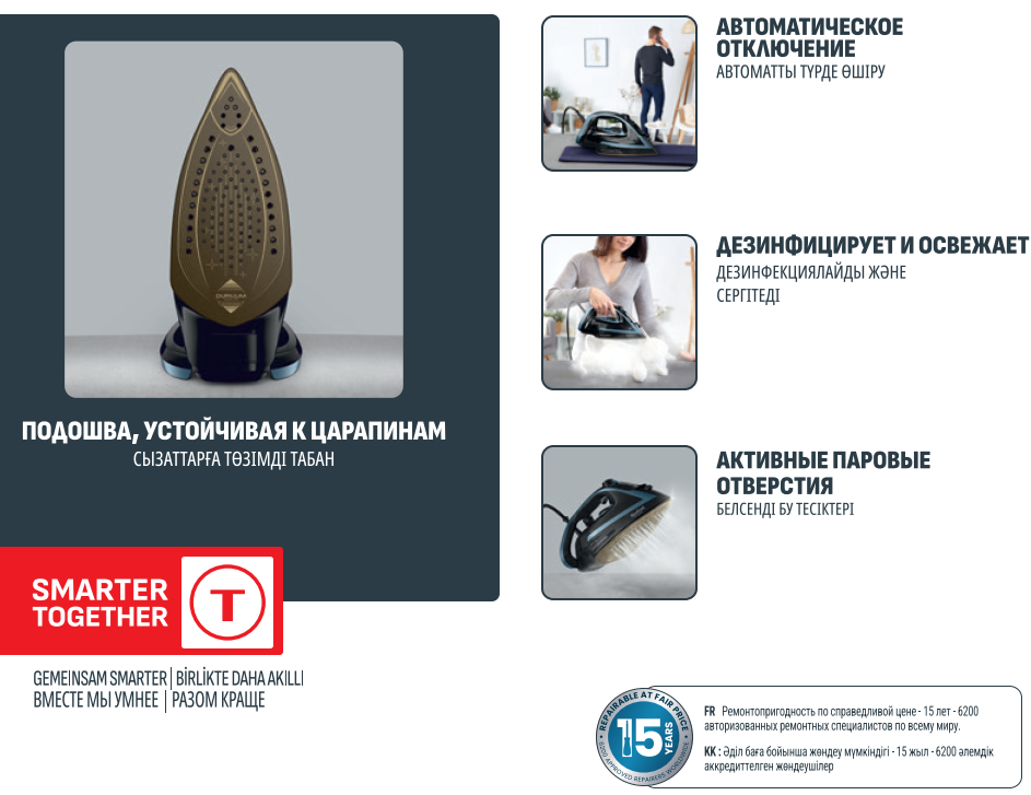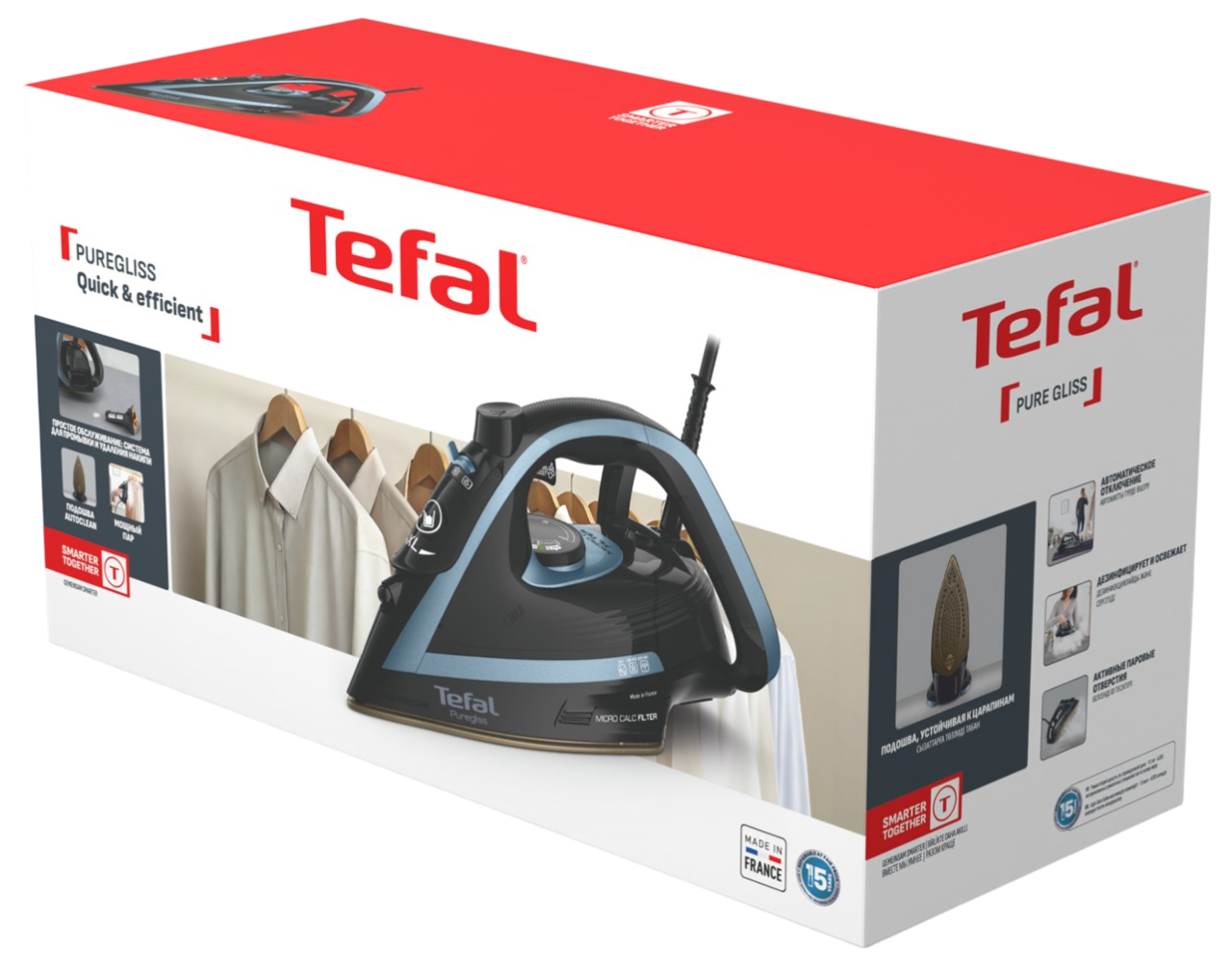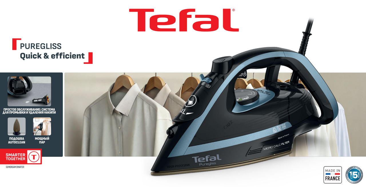 Утюг Tefal Puregliss FV8R67F1 - это мощный и функциональный прибор, который обеспечит вам безупречные результаты глажки с максимальным комфортом. С мощностью 3000Вт и подачей пара до 50г/мин, бытовая техника для дома быстро и эффективно разглаживает любые складки. Паровой удар до 280г/мин позволяет справляться с самыми стойкими заломами на белье и одежде, а продуманная подошва Durilium Airglide Autoclean обеспечивает отличное скольжение портативного утюга Тефаль и равномерное распределение пара по ткани. Система самоочистки и защита от капель делают использование умного утюга с паром не только безопасным, но и удобным.