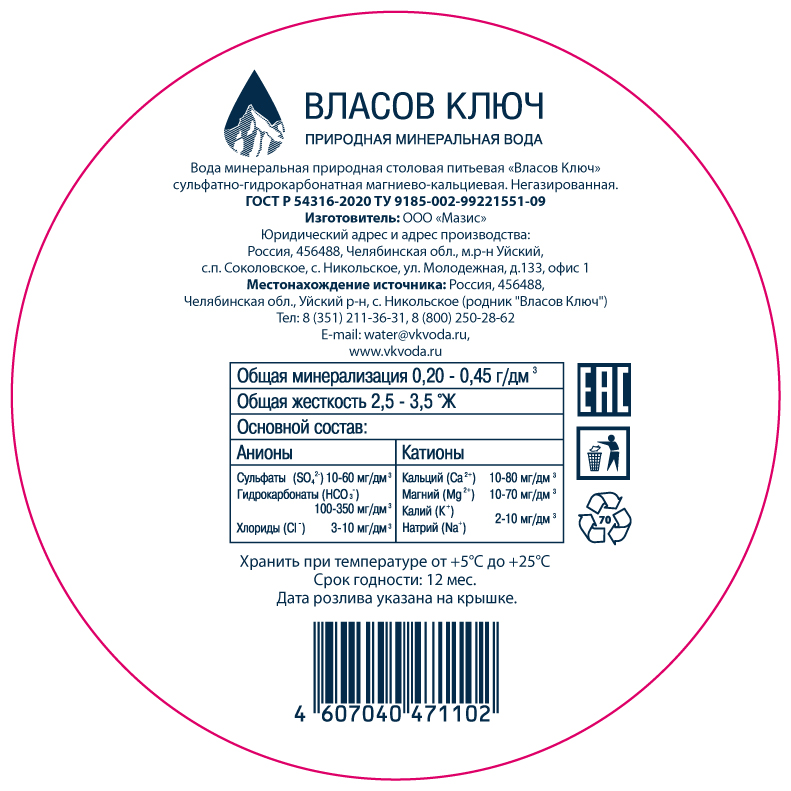 Родниковая природная минеральная столовая вода. Обладает уникальным натуральным составом микроэлементов, идеально подходит для ежедневного потребления, восстанавливает и поддерживает минеральный баланс организма, являющийся ключом к здоровью. Это вода с естественной минерализацией, природным оптимальным балансом микроэлементов и превосходным вкусом. При производстве бутилированной воды Власов Ключ не происходит изменения природной структуры, вода остается живой, сохраняя изначальные качества и натуральные пропорции минералов.