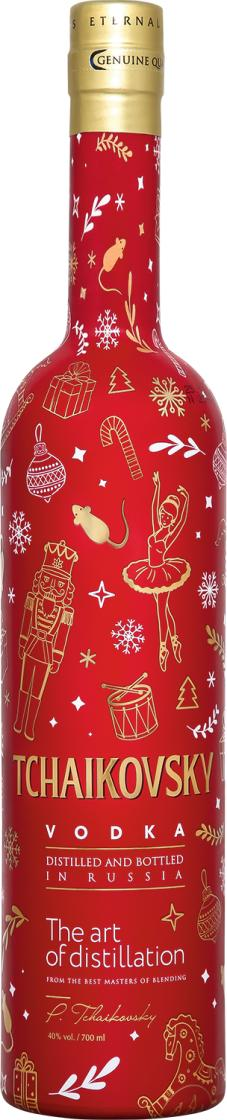 Чайковский— классическая водка, обладающая тонким ароматом и гладким, свежим вкусом. При изготовлении водки используется спирт класса Люкс и чистая питьевая вода, которые подвергаются обработке обезжиренным сухим молоком для придания мягкости напитку, двойной фильтрации угольным фильтром и отдых для получения более тонких нот в органолептике. На этикетке изображено знаменитое произведение П.И. Чайковского Лебединое озеро. Водку рекомендуется подавать к традиционным блюдам русской и кавказской кухни, в особенности — к соленьям и маринадам, к пряным рыбным и острым мясным блюдам.