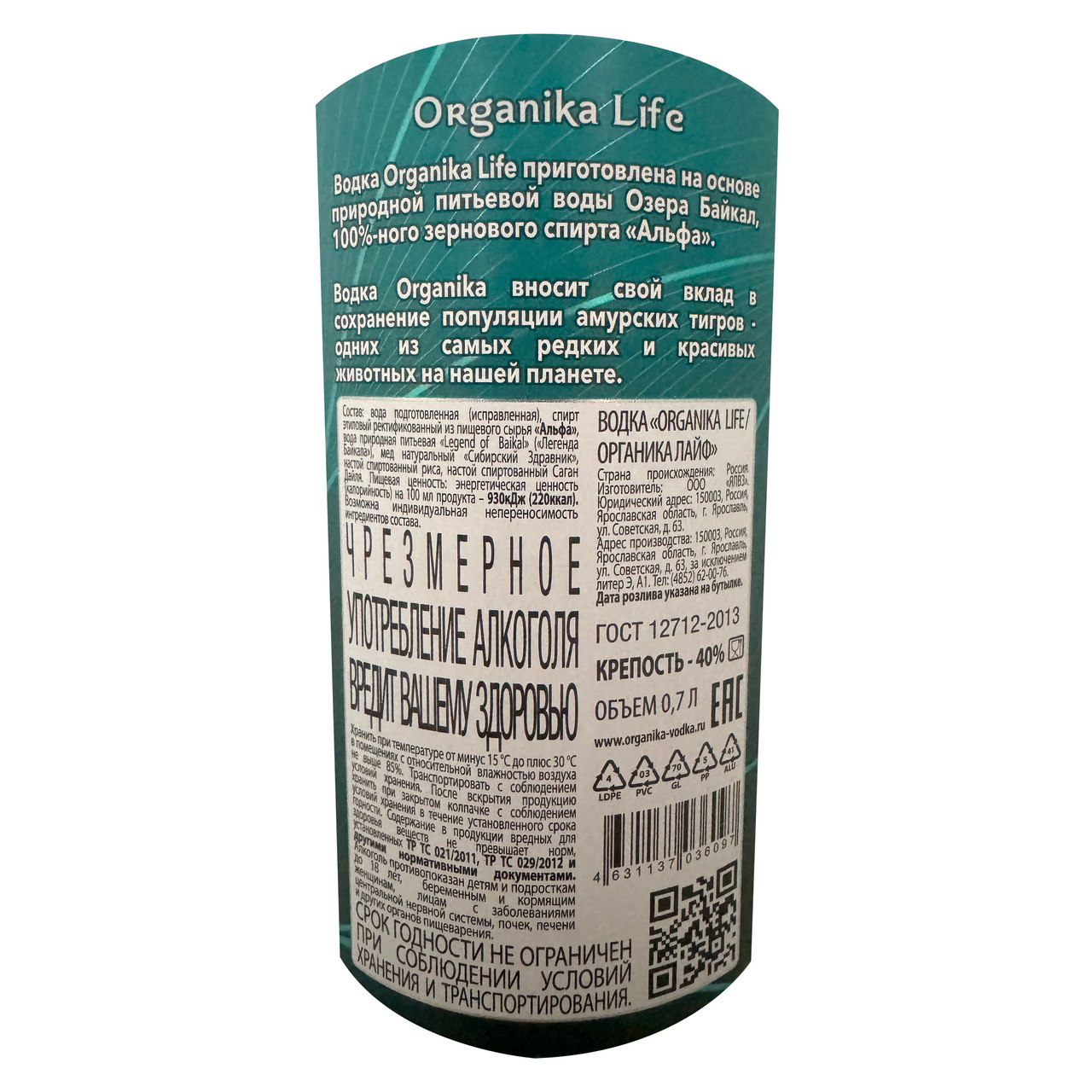 Водка Organika Life, 0,7 л – премиальный алкогольный напиток прозрачного цвета, который сочетает в себя высокое качество и использование натуральных ингредиентов. Водка обладает ровным, мягким вкусом. Послевкусие – длительное, согревающее. В качестве закуски могут выступать мясные и рыбные изделия – говядина, лосось, омуль и нельма. Напиток хорошо подойдет в дополнение к супам, сытным салатам и овощным блюдам. Он идеально сочетается с маринованными грибами и различными соленьями. Водку можно употреблять в чистом виде или в составе оригинальных коктейлей. В первом случае ее принято наливать в фужеры на короткой ножке или стопки, а во втором случае в бокалы с толстыми стенками. Напиток поступает в продажу в стеклянной бутылке вытянутой формы с привлекательным дизайном, эффектной эмблемой в виде тигра. Он станет хорошим вариантом небольшого подарка для близких людей на любые мероприятия. Organika – это известная торговая марка, которая появилась сравнительно давно. Выпускаемая продукция производится в Ярославском ликеро-водочном заводе, основанном в 1901 году. На всех этапах создания напитков применяется современное оборудование, которое дает возможность проводить бережную обработку всех ингредиентов. К отличительным особенностям относятся: экологичность, использование воды озера Байкал зернового спирта Альфа.