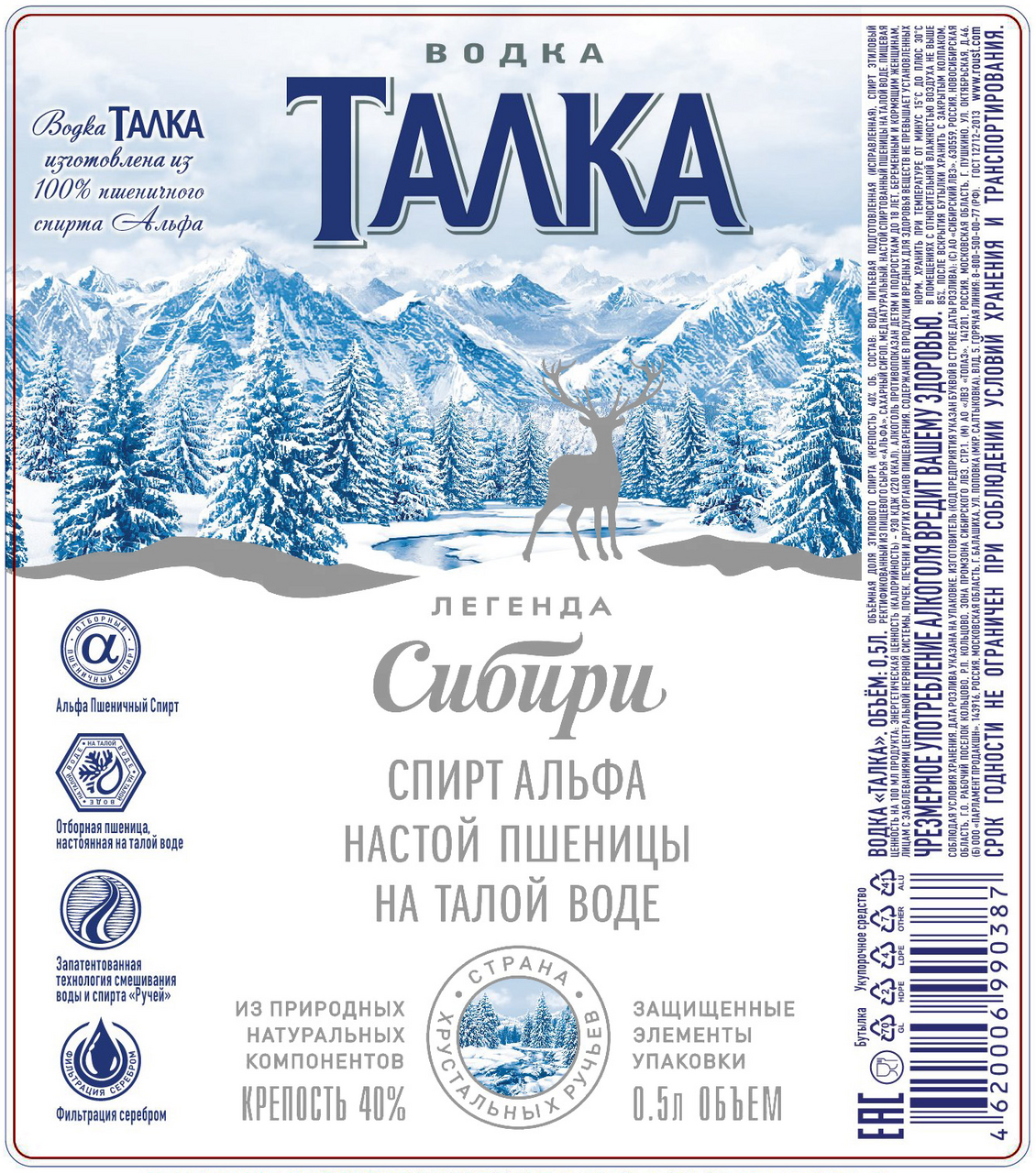 Водка Талка берет свое начало в глубинах Сибири, среди заснеженных просторов, суровой северной природы, величавых рек и свежего таежного воздуха. Это настоящая зерновая водка, вобравшая в себя всю пользу этого знаменитого края. Она обладает вкусом зерновых культур и отлично сочетается с супами, картофелем, маринованными и солеными овощами, грибами, мясом, рыбой, пельменями, холодными закусками и лимоном. В основе водки – зерновой спирт Альфа и вода из собственной артезианской скважины, дополнительно прошедшая многоступенчатую фильтрацию.