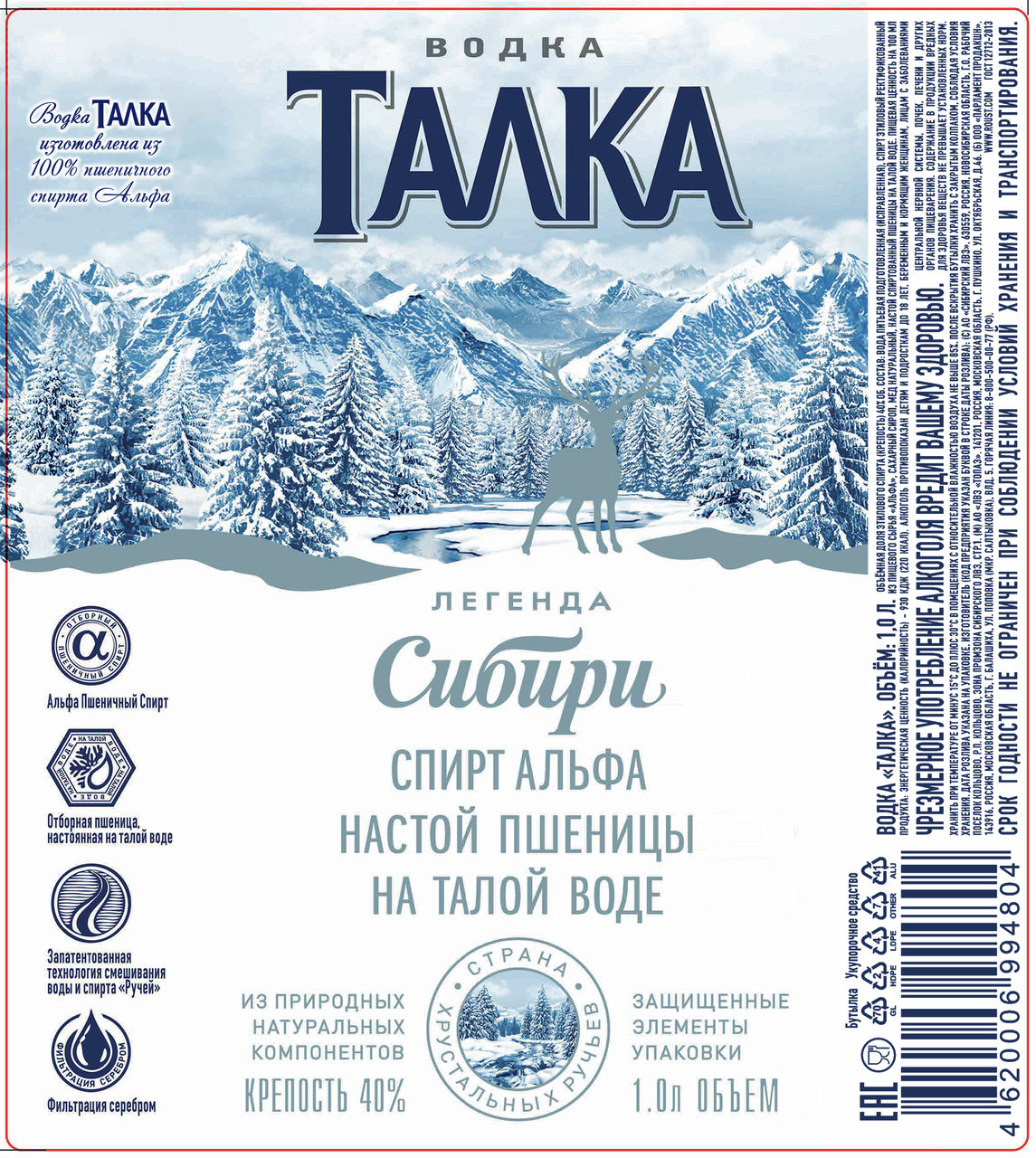 Водка Талка берет свое начало в глубинах Сибири, среди заснеженных просторов, суровой северной природы, величавых рек и свежего таежного воздуха. Это настоящая зерновая водка, вобравшая в себя всю пользу этого знаменитого края. Она обладает вкусом зерновых культур и отлично сочетается с супами, картофелем, маринованными и солеными овощами, грибами, мясом, рыбой, пельменями, холодными закусками и лимоном. В основе водки – зерновой спирт Альфа и вода из собственной артезианской скважины, дополнительно прошедшая многоступенчатую фильтрацию.