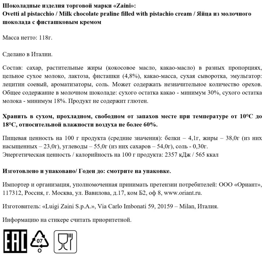 Итальянская компания Zaini производит шоколадные изделия более 100 лет. Компания уделяет самое пристальное внимание отбору и исследованию сырья, а так же безопасности всего производственного цикла для создания шоколада и конфет с их неповторимым вкусом. Качество продукции гарантировано самыми строгими международными сертификатами. Отличный вариант для подарка родным и близким, а также для нарядного декора праздничного стола.