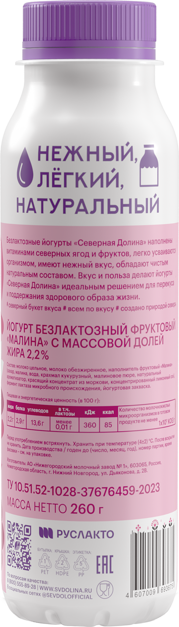 Йогурт питьевой Северная долина безлактозный малина 2.2%, 260г