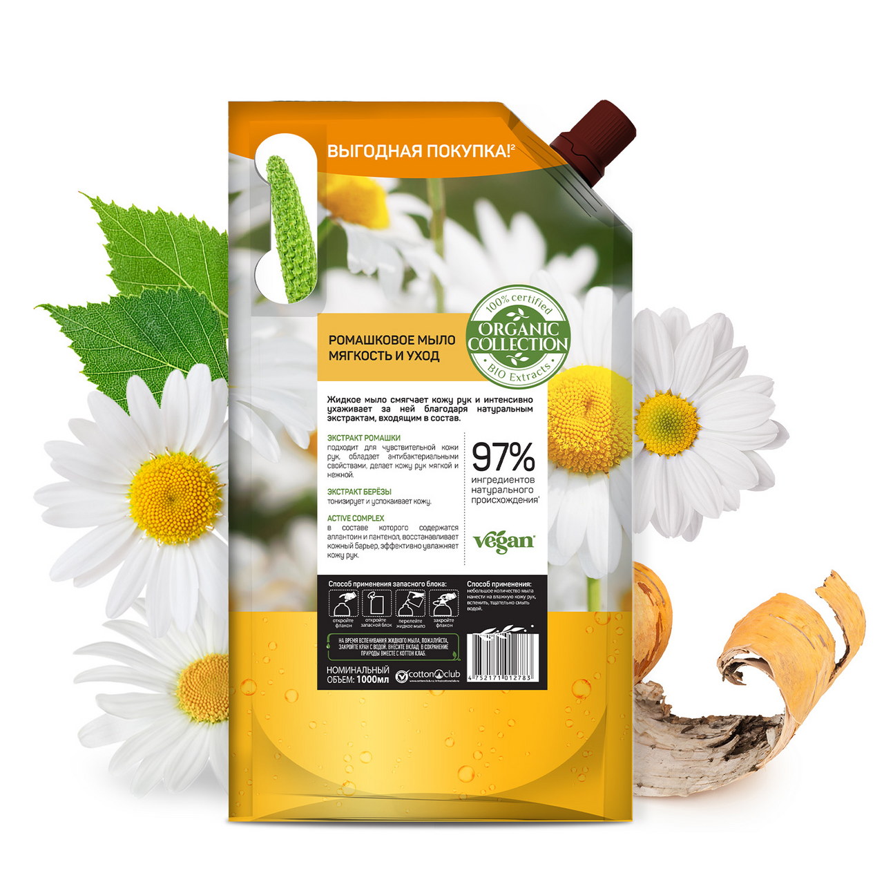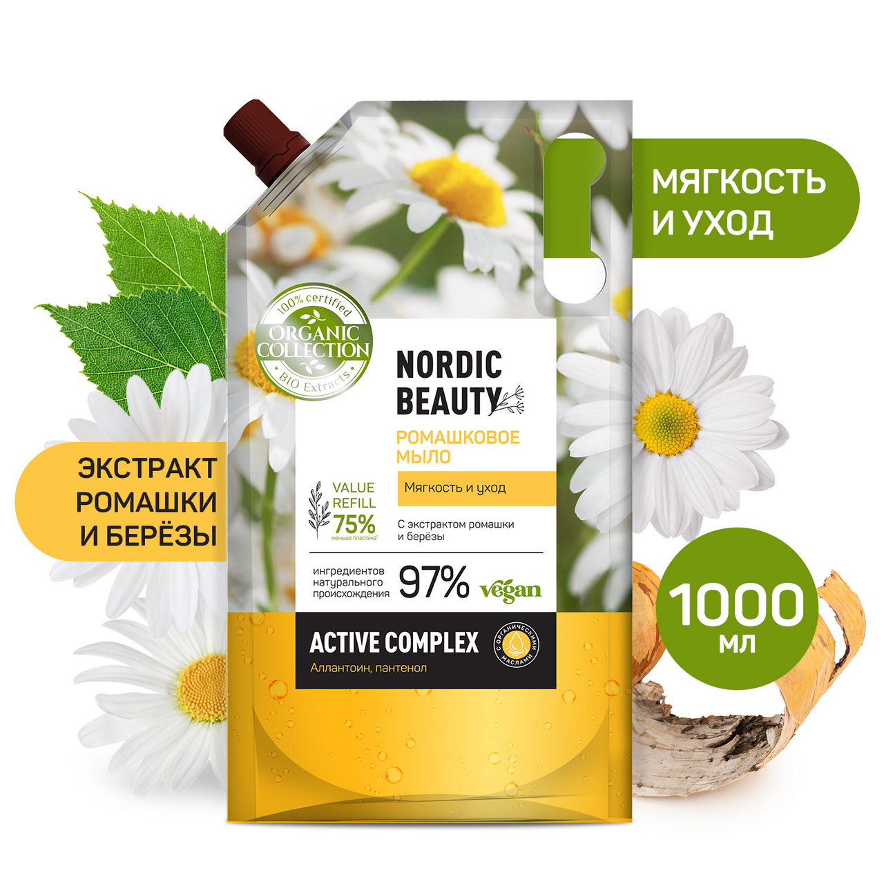 Жидкое мыло смягчает кожу рук и интенсивно ухаживает за ней благодаря натуральным экстрактам, входящим в состав. Экстракт ромашки подходит для чувствительной кожи рук, он обладает антибактериальными свойствами, делает кожу рук мягкой и нежной. Экстракт березы тонизирует и успокаивает кожу. Active complex в составе которого содержатся аллантоин и пантенол, восстанавливает кожный барьер, эффективно увлажняет кожу рук.