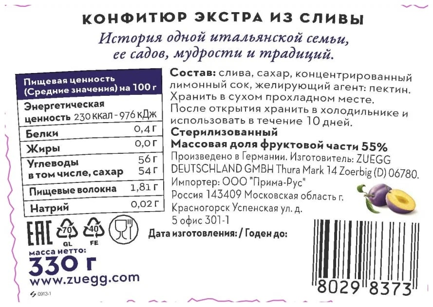 Слива, сахар, концентрированный лимонный сок, желерующий агент: пектин.